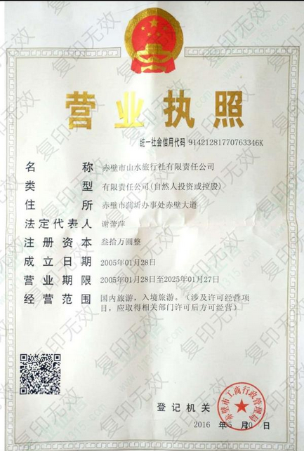 赤壁市山水旅行社有限责任公司成立于2005年01月28日,注册地位于赤壁市陆水路11号,法人代表为谢蕾萍。经营范围包括国内旅游,入境旅游。(涉及许可经营项目,应取得相关部门许可后方可经营)